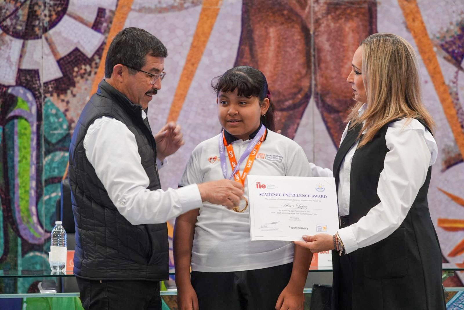 De manera especial, se realizó la entrega de un reconocimiento a la estudiante López Arcos Alexa Valentina, del grupo Junior 5, otorgado por el Instituto Nacional de la Educación, por haber obtenido puntaje perfecto durante el ciclo escolar 2024–2025 en la certificación TOEFL Primary, destacando su desempeño académico sobresaliente.