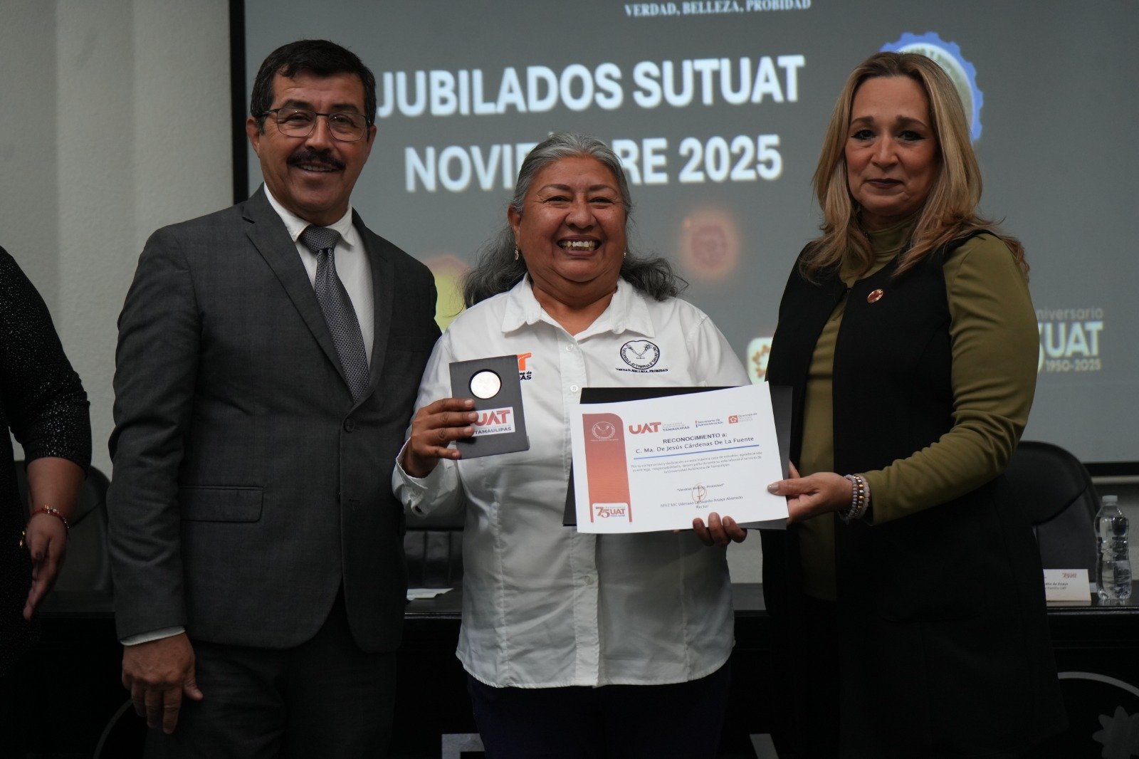 El rector Dámaso Anaya Alvarado presidió la entrega de reconocimientos a las y los jubilados del Sindicato Único de Trabajadores de la Universidad Autónoma de Tamaulipas (SUTUAT), a quienes agradeció por todos los años de esfuerzo y dedicación al servicio de la casa de estudios.